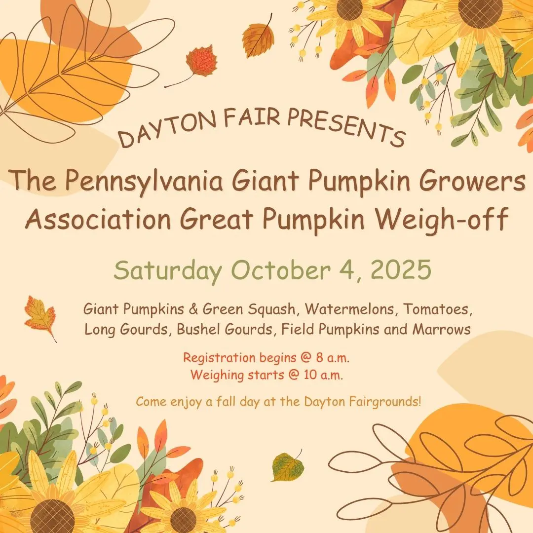 Join us on October 4th, 2025 at the Dayton Fairgrounds in Armstrong County for the PGPGA Great Pumpkin Weigh-off.